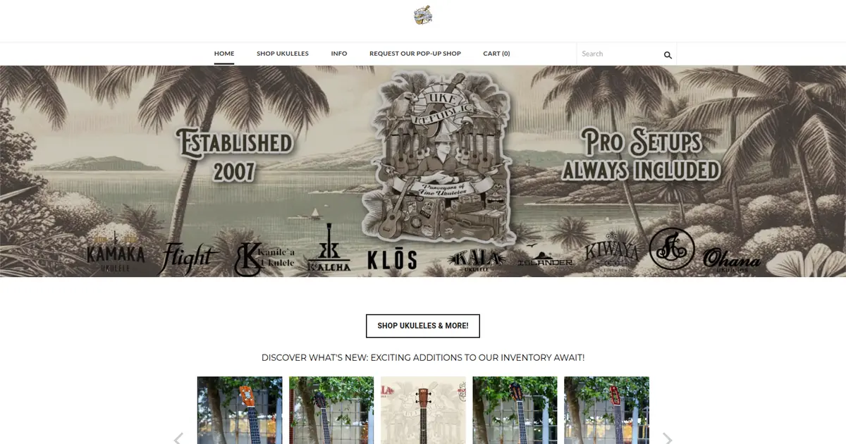 Music / Instruments Image Ukuleles and gear curated with care for the Tiki music scene. Not just instruments—each uke is part of a larger tropical story. ☰ Quick Info