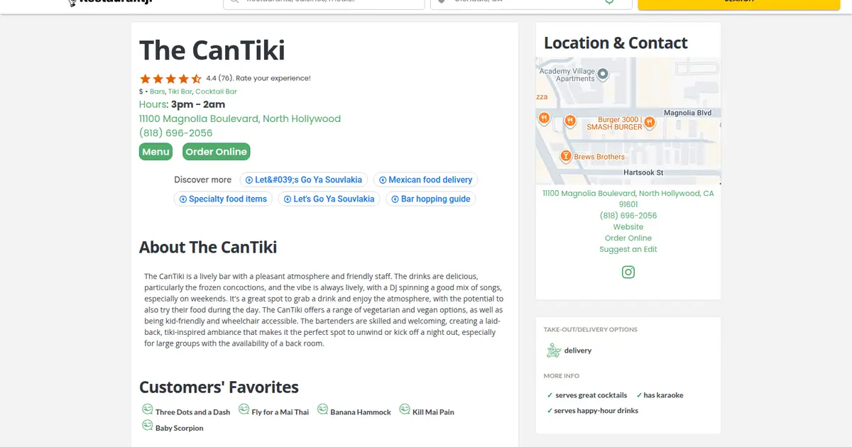 On East Cypress Street in Glendale, California, The CanTiki stands as a vibrant homage to mid-century Polynesian pop culture, a place where the spirit of the South Pacific is reimagined with a distinctly Californian twist. The exterior, adorned with bamboo and thatch, hints at the immersive experience within. Inside, the air is thick with the scent of tropical fruits and the soft glow of tiki torches casts playful shadows on the walls, which are adorned with vintage surfboards and carved wooden masks.
