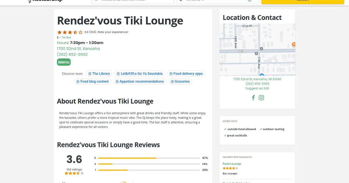 A kaleidoscope of Polynesian dreams awaits at Rendez'vous Tiki Lounge, where the vibrant spirit of the South Pacific collides with the heartland charm of Kenosha, Wisconsin. This eclectic oasis on 52nd Street is a sensory feast, with bamboo-clad walls and flickering tiki torches casting a warm, inviting glow. The air is perfumed with the sweet aroma of tropical fruits, mingling with the earthy scent of rum, as patrons sip on expertly crafted Mai Tais and Zombies, each drink a testament to the art of mixology.