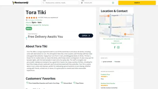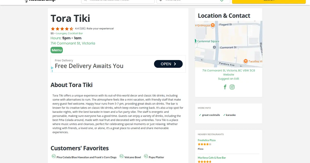 A cascade of vibrant colors greets you at Tora Tiki, a spirited oasis on Victoria's bustling Douglas Street. This tiki bar, a nod to the mid-century Polynesian pop culture, stands out with its eclectic mix of bamboo, thatch, and carved wooden masks, each telling a story of the Pacific's rich tapestry. The air is thick with the scent of tropical fruits and spices, a prelude to the exotic cocktails that await.