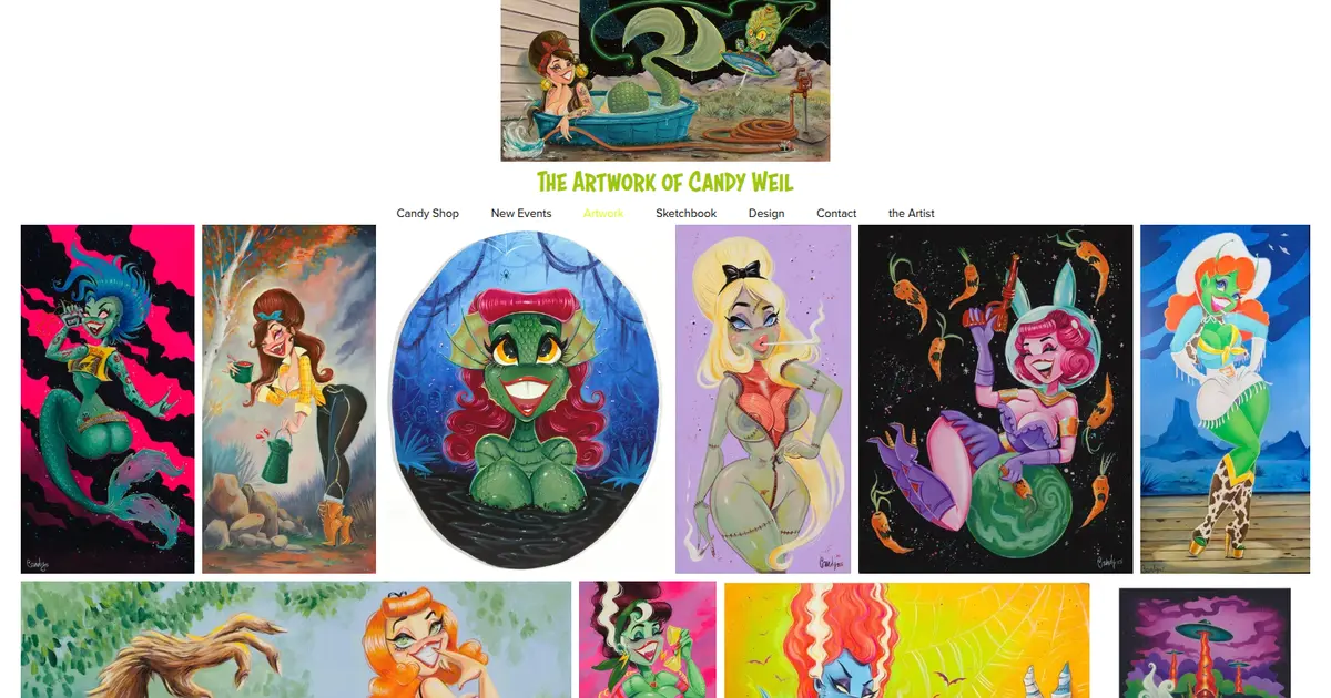 Candy Weil, also known as Candy Wild, is a California-based artist celebrated for her vibrant contributions to the lowbrow and pop surrealism art scenes. Her work seamlessly blends retro Americana with playful, edgy themes, drawing inspiration from tiki culture, classic monsters, pin-up aesthetics, and vintage cartoons. Each piece showcases her distinctive style, characterized by bold colors and expressive characters.