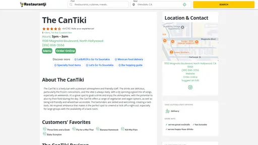 On East Cypress Street in Glendale, California, The CanTiki stands as a vibrant homage to mid-century Polynesian pop culture, a place where the spirit of the South Pacific is reimagined with a distinctly Californian twist. The exterior, adorned with bamboo and thatch, hints at the immersive experience within. Inside, the air is thick with the scent of tropical fruits and the soft glow of tiki torches casts playful shadows on the walls, which are adorned with vintage surfboards and carved wooden masks.