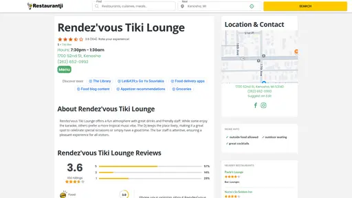 A kaleidoscope of Polynesian dreams awaits at Rendez'vous Tiki Lounge, where the vibrant spirit of the South Pacific collides with the heartland charm of Kenosha, Wisconsin. This eclectic oasis on 52nd Street is a sensory feast, with bamboo-clad walls and flickering tiki torches casting a warm, inviting glow. The air is perfumed with the sweet aroma of tropical fruits, mingling with the earthy scent of rum, as patrons sip on expertly crafted Mai Tais and Zombies, each drink a testament to the art of mixology.