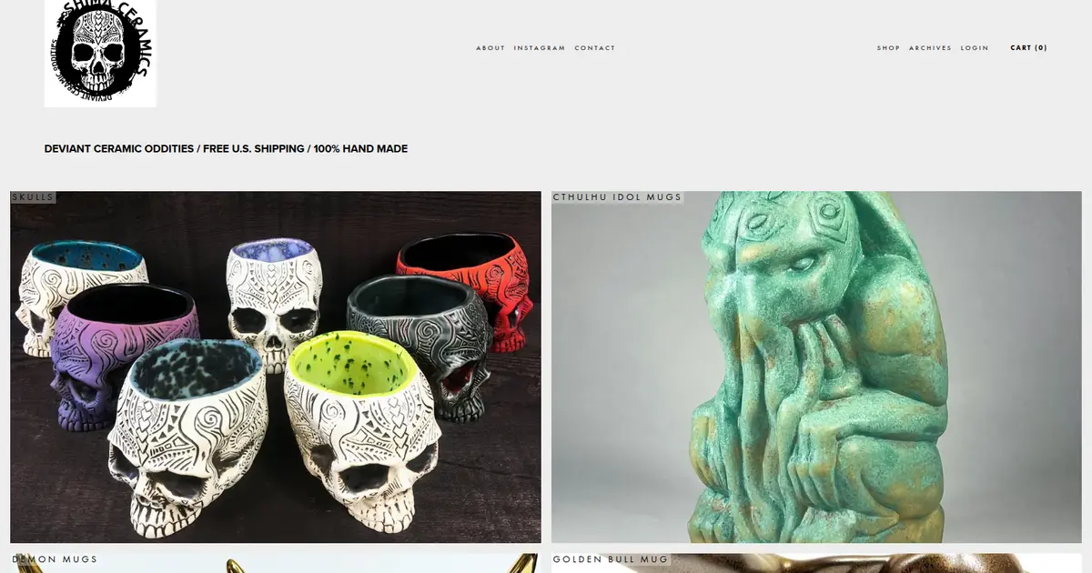 Shima’s portfolio includes an array of “deviant ceramic oddities,” such as the Shrunken Skull Mugs, Cthulhu Idol Mugs, and the Shub-Niggurath Chalice. These pieces often feature complex designs that challenge the limits of ceramic artistry, sometimes requiring intricate multi-piece molds.