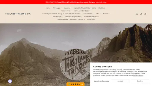 TikiLand Trading Co. is a California-based brand that designs and produces limited-edition tiki mugs, apparel, and home décor inspired by island escapism and pop culture nostalgia. Known for high-profile artist collaborations and officially licensed creations, TikiLand blends craftsmanship with storytelling; offering collectibles that range from whimsical to reverent. Each mug is released in small batches and often sells out quickly, making them a centerpiece of many modern tiki collections.